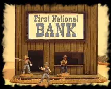 A good close up of the bank's frontage. Most of my buildings do not have doors or windows, they just seem to get in the way. I am experimenting putting in plastic windows, see the Sheriff's Office.