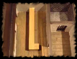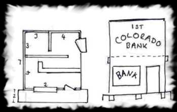 First National Bank All good Western towns should have at least one bank, to be a focus for bad guy activity. No Wild West campaign would be complete without a number of bank robberies. I looked at pictures of western towns and various movies. It is clear from all sources that the bank would be one of the first buildings made from permanent materials, brick & stone. My bank is no exception. the brick work is achieved with the aid of some brick looking wallpaper. The bank has a strong room with bars and a back office. It is pretty much as the original sketch I drew, but for some reason I changed round the door, window and counter.