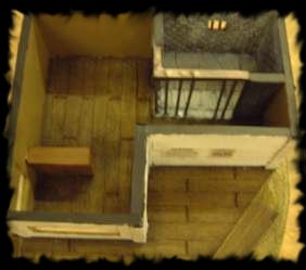 The interior of the Sheriff's Office featuring the jail cell with bars made from cocktail sticks. The small counter on the left is the only piece of furniture in the building. I originally had grand plans for gun racks, stoves, desks etc but decided that they would only get in the way of game play. If you have any comments, suggestions or just want to tell us what decent chaps we are please email us email: blazeofglory@SOTG |