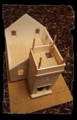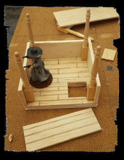 Construction has begun, walls stuck to base. Tower platform with sides fitted and doll's house staircase bannisters added to support the roof. I always keep a couple of figures to hand to make sure I am happy with the scale of what I am making.