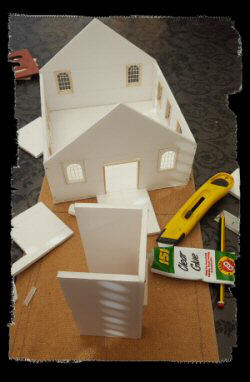 Sand going on the base. The finished model has had front steps, roofs and balsa cladding on all its walls added. It is now ready for painting. To see the finished model return to the CHAPEL If you have any comments, suggestions or just want to tell us what decent chaps we are please email us email: tim.eagling@gmail.com |