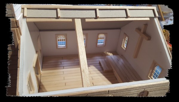 Interior detail added, roof beams in place and a LARGE crucifix too:0)